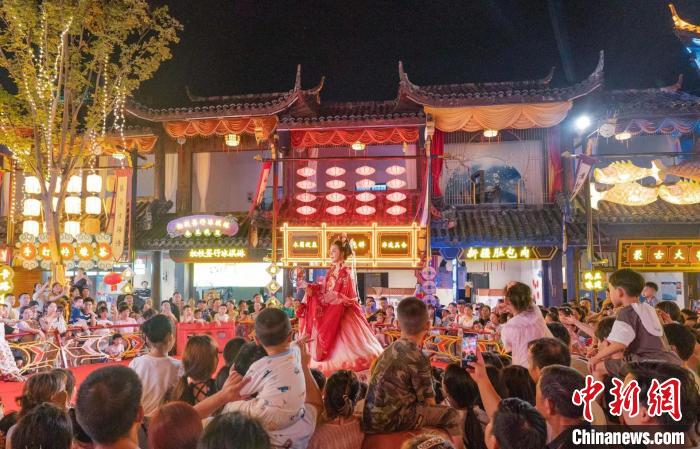 10月18日,游客在木蘭不夜城觀看演出。張暢 攝
