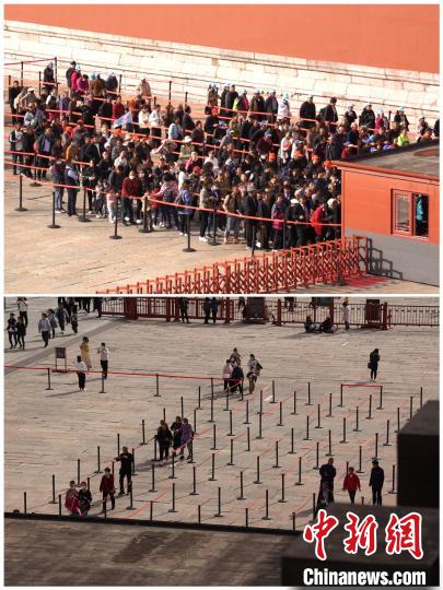 上圖為10月20日9時(shí)許,故宮博物院午門外檢票現(xiàn)場(chǎng);下圖為10月19日13時(shí)許,故宮博物院午門外檢票現(xiàn)場(chǎng)。 故宮博物院供圖