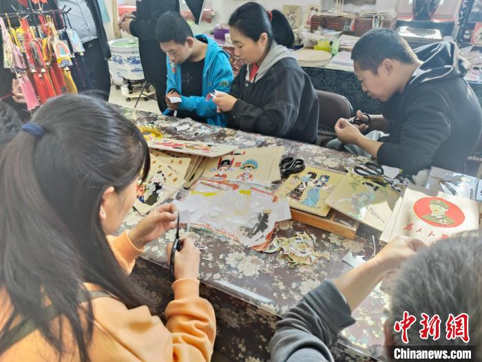 在撫順市非物質(zhì)文化遺產(chǎn)布貼畫助殘培訓基地,殘疾人制作布貼畫。王晨 攝