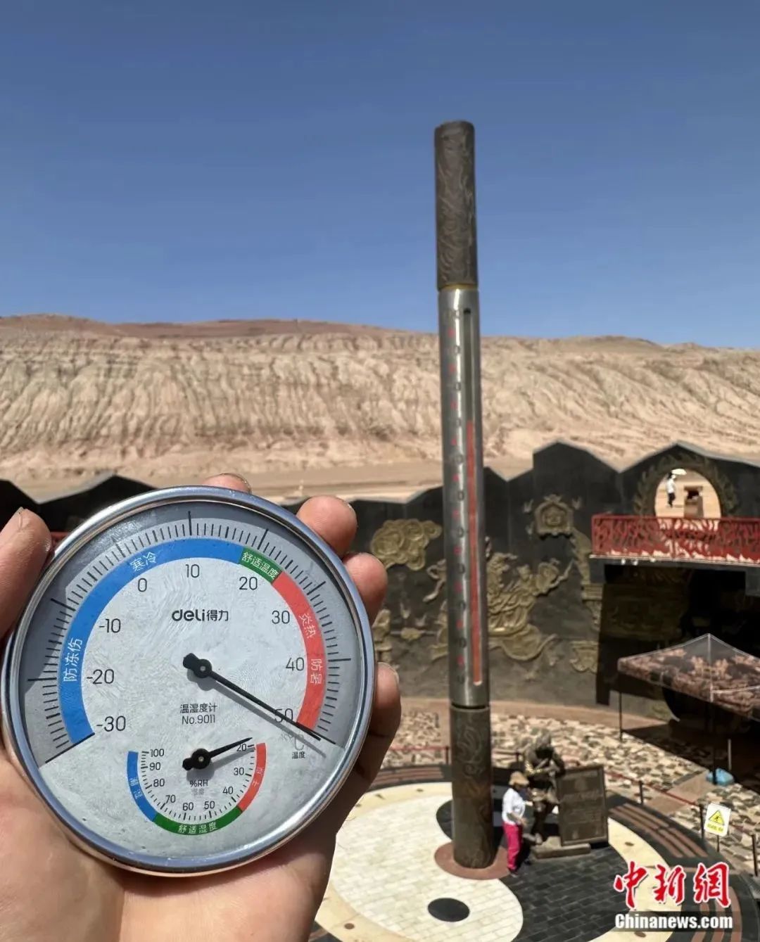 火焰山景區(qū)內(nèi)金箍棒溫度計溫度超50度。木塔力甫 攝