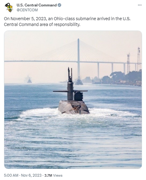 據(jù)報道,當(dāng)天,美國中央司令部在社交媒體上發(fā)帖稱,“11月5日,一艘‘俄亥俄’級戰(zhàn)略潛艇抵達(dá)中東地區(qū)?!?/p>