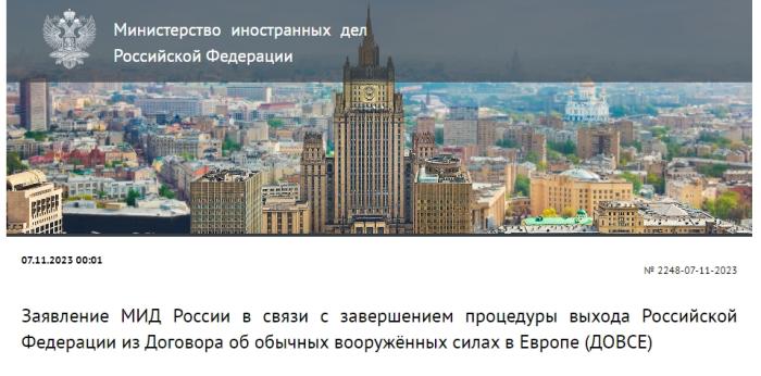 當(dāng)?shù)貢r(shí)間11月7日,俄羅斯外交部發(fā)布關(guān)于俄羅斯完成退出《歐洲常規(guī)武裝力量條約》程序的聲明。圖片來源:俄羅斯外交部網(wǎng)站