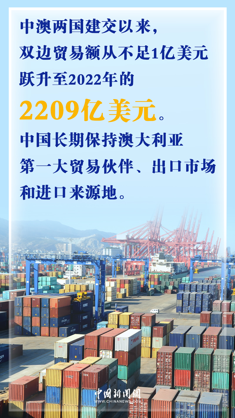 據(jù)中國(guó)駐澳大利亞大使館網(wǎng)站數(shù)據(jù),中澳兩國(guó)建交50年來,雙邊貿(mào)易額從當(dāng)時(shí)不足1億美元,躍升至2022年的2209億美元。中國(guó)長(zhǎng)期保持澳大利亞第一大貿(mào)易伙伴、出口市場(chǎng)和進(jìn)口來源地的地位。與此同時(shí),越來越多的澳大利亞優(yōu)質(zhì)農(nóng)產(chǎn)品走進(jìn)中國(guó)家庭,豐富了中國(guó)消費(fèi)者的選擇。