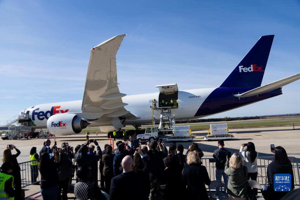 11月8日,運(yùn)送大熊貓的專機(jī)從美國弗吉尼亞州的華盛頓杜勒斯國際機(jī)場(chǎng)起飛。新華社記者劉杰攝