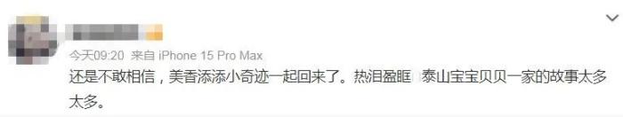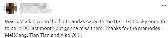 有網(wǎng)友回憶起與大熊貓的點(diǎn)滴時(shí)說(shuō),“當(dāng)?shù)谝慌笮茇垈儊?lái)到美國(guó)時(shí),我還只是個(gè)孩子。上個(gè)月很幸運(yùn)能前往華盛頓,我會(huì)想念它們的。謝謝你們帶來(lái)的回憶——美香、添添和小奇跡。”