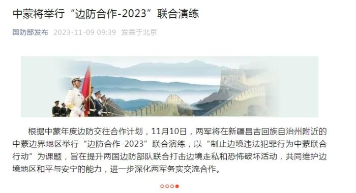 中新網(wǎng)11月9日電 據(jù)國防部發(fā)布微信公眾號消息,根據(jù)中蒙年度邊防交往合作計劃,11月10日,兩軍將在新疆昌吉回族自治州附近的中蒙邊界地區(qū)舉行“邊防合作-2023”聯(lián)合演練,以“制止邊境違法犯罪行為中蒙聯(lián)合行動”為課題,旨在提升兩國邊防部隊聯(lián)合打擊邊境走私和恐怖破壞活動,共同維護邊境地區(qū)和平與安寧的能力,進一步深化兩軍務(wù)實交流合作。