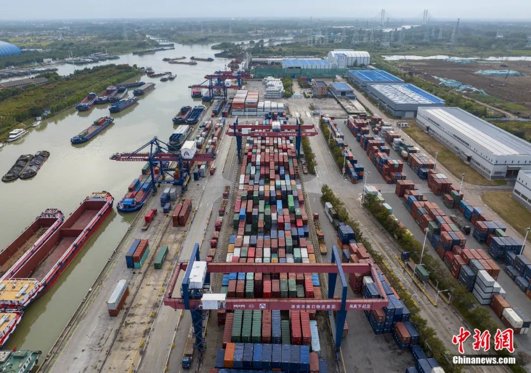 2023年10月7日,京杭大運河江蘇省淮安市新港集裝箱碼頭一派忙碌景象。賀敬華 攝