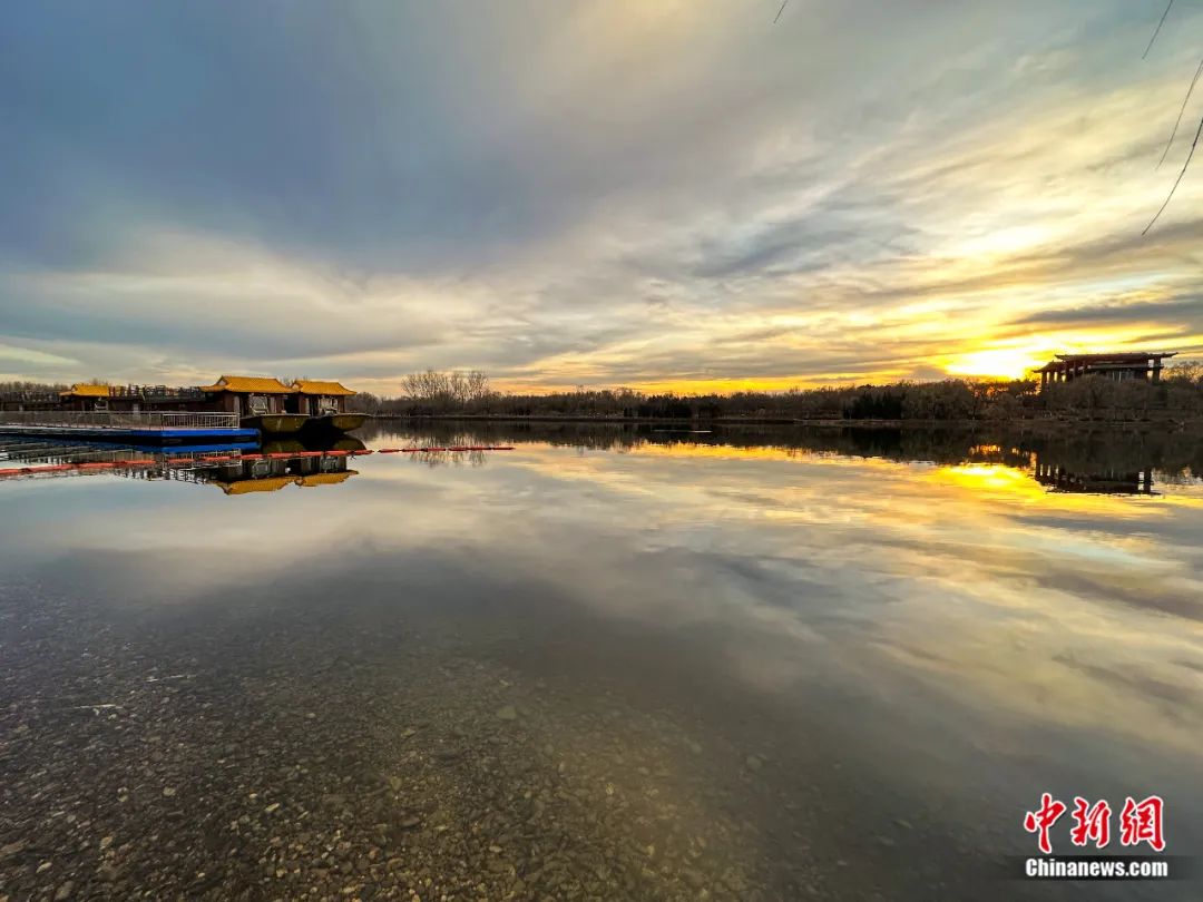 2022年12月11日,夕陽映照大運河,北京通州大運河森林公園里落日余暉映晚霞,一抹夕陽美如畫。王丹楓 攝