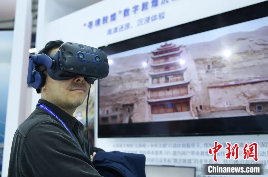 2023年世界互聯(lián)網(wǎng)大會“互聯(lián)網(wǎng)之光”博覽會上,一位參觀者使用VR眼鏡體驗數(shù)字敦煌。王剛 攝
