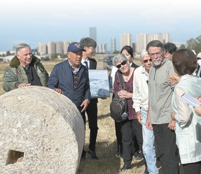 在云南昆明呈貢機(jī)場(chǎng)舊址,代表團(tuán)一行聆聽講解員講述石碾背后的故事。呈貢機(jī)場(chǎng)曾是飛虎隊(duì)在昆明的主要基地之一,機(jī)場(chǎng)建設(shè)期間,當(dāng)?shù)厝嗣窭瓌?dòng)巨大石碾平整跑道,付出艱苦努力。