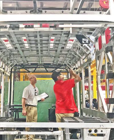 在位于美國加州蘭卡斯特市的比亞迪大巴工廠里,工作人員正在檢查設(shè)備。