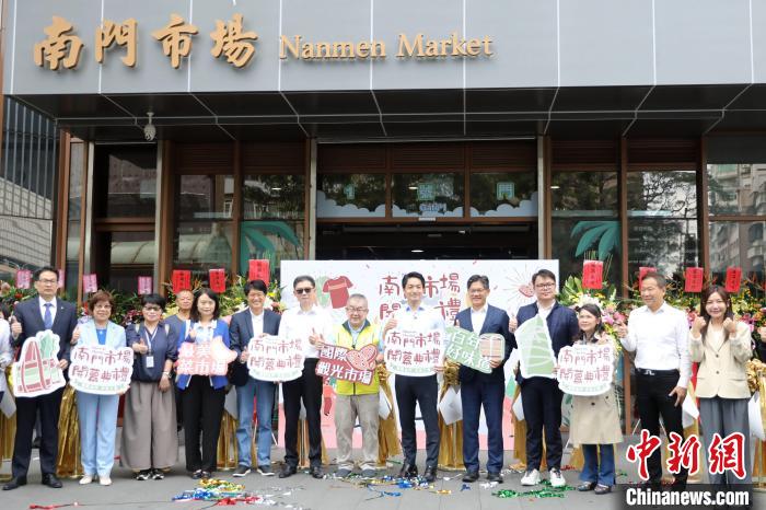 11月16日,經過四年改建的臺北南門市場正式重新開業(yè),圖為出席開幕式的嘉賓剪彩后合影?!≈行律缬浾?陳小愿 攝