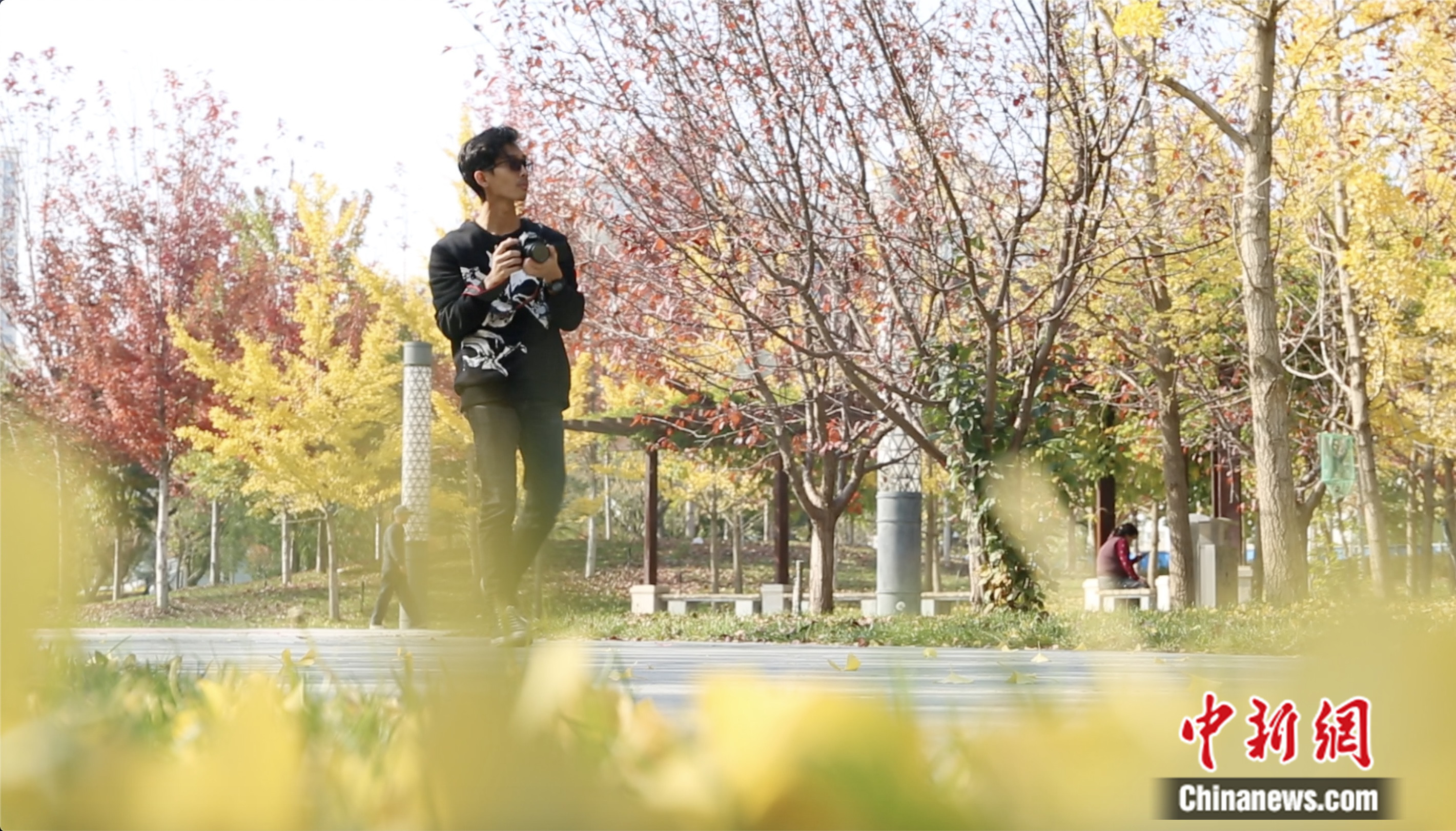 2023年10月,印尼留學(xué)生陳君其在校園中漫步,拍攝秋景。高瑩 攝