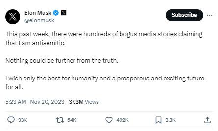 據(jù)報(bào)道,馬斯克在社交媒體平臺(tái)X上寫道,“過去一周,有數(shù)百個(gè)虛假的媒體報(bào)道聲稱我是反猶太主義者。事實(shí)并非如此。我只希望人類一切都好,所有人都有一個(gè)繁榮和令人興奮的未來(lái)。”