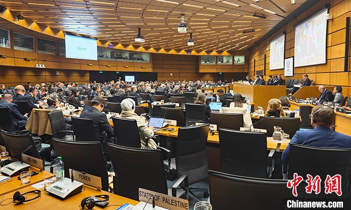 11月22日,中國常駐國際原子能機(jī)構(gòu)代表李松率團(tuán)出席在維也納召開的國際原子能機(jī)構(gòu)11月理事會,就巴以沖突和以色列核問題發(fā)言。圖為會議現(xiàn)場。 中新社發(fā) 中國常駐維也納代表團(tuán)供圖