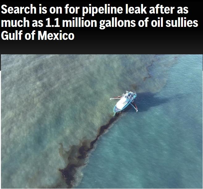 據(jù)報(bào)道,美國(guó)國(guó)家海洋和大氣管理局(NOAA)稱,當(dāng)?shù)貢r(shí)間16日上午約9點(diǎn),在水面上發(fā)現(xiàn)了一層油膜,10分鐘后,第三海岸中游管道公司報(bào)告了管道泄漏。該機(jī)構(gòu)在網(wǎng)站上表示,當(dāng)天下午2點(diǎn)的一次報(bào)告顯示有3到4英里寬的浮油,“到處都是黑色的油”。