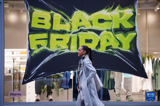 11月22日,在英國曼徹斯特,一名女子走過“黑色星期五”促銷廣告。新華社發(fā)(喬恩·休珀攝)