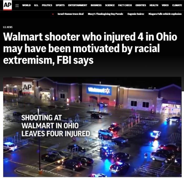 FBI稱,當?shù)貢r間20日晚上,美國俄亥俄州代頓市郊區(qū)的一家沃爾瑪發(fā)生槍擊事件,四名購物者受傷,包括兩名黑人女性、一名白人女性和一名白人男性。