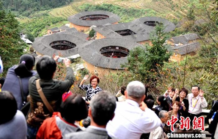2011年,來自世界五大洲三十多個國家和地區(qū)的海內(nèi)外華人作家、學者,參加完在廣州舉辦的世界華文文學研討會后,來到福建漳州,參觀南靖土樓群。王東明 攝
