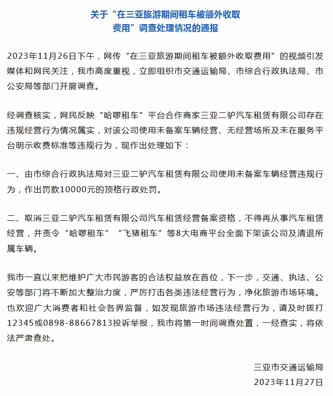 中新網(wǎng)11月28日電 據(jù)三亞發(fā)布微信公眾號(hào)消息,三亞市交通運(yùn)輸局27日發(fā)布通報(bào)稱,2023年11月26日下午,網(wǎng)傳“在三亞旅游期間租車被額外收取費(fèi)用”的視頻引發(fā)媒體和網(wǎng)民關(guān)注,三亞市高度重視,立即組織市交通運(yùn)輸局、市綜合行政執(zhí)法局、市公安局等部門(mén)開(kāi)展調(diào)查。