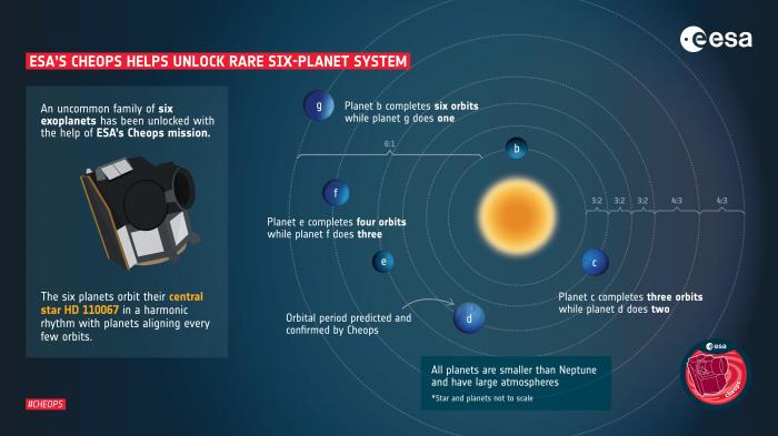 美國國家航空航天局(NASA)的“凌日系外行星巡天衛(wèi)星”(TESS)在2020年和2022年觀測 HD110067,發(fā)現(xiàn)該恒星亮度的數(shù)次下降,加之來自“系外行星特性探測衛(wèi)星”(CHEOPS)的更多觀測,論文第一作者和通訊作者、美國芝加哥大學(xué)R. Luque與同事及合作者研究認(rèn)為,這些跡象可解釋為6顆行星從恒星前面經(jīng)過。通過研究3顆最深處行星,他們計(jì)算了所有6顆行星的軌道,從最深處的約9天,到最外層的約54天。
