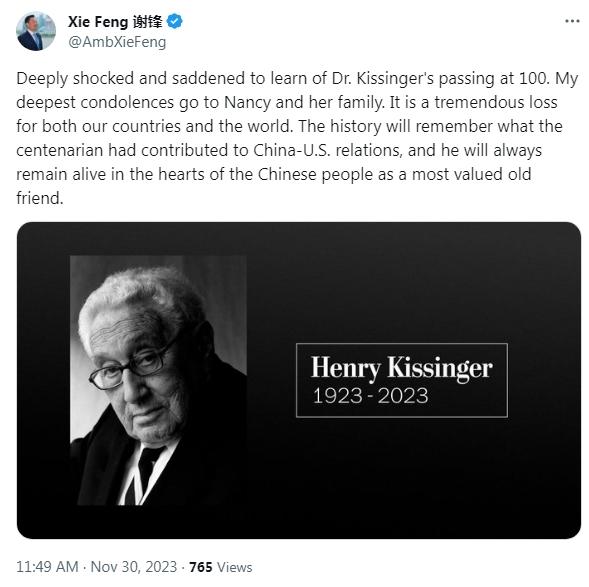 謝鋒寫道,“得知基辛格博士去世,享年100歲,我深感震驚和悲痛。我向南希(基辛格夫人)以及她的家人致以最深切的哀悼。這對我們(中美)兩國和世界來說都是巨大的損失。歷史將銘記這位百歲老人為中美關(guān)系作出的貢獻,他將作為最珍貴的老朋友,永遠活在中國人民心中?!?/p>