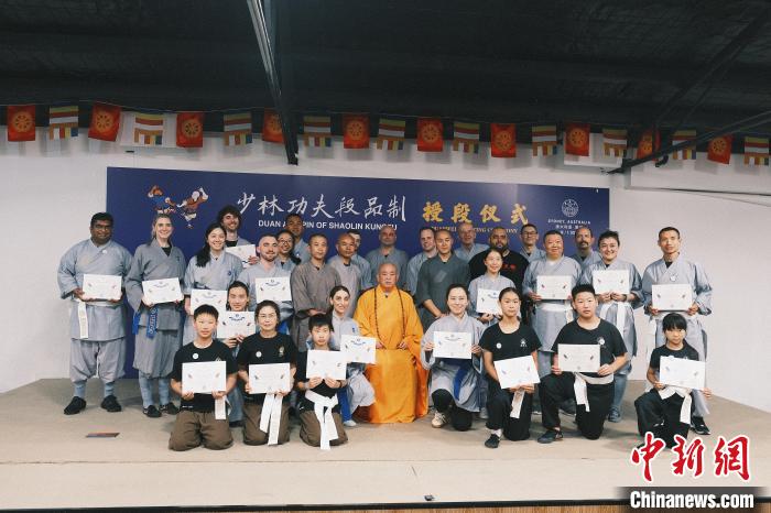 當(dāng)?shù)貢r(shí)間12月1日,澳大利亞少林寺禪武堂于1日在悉尼隆重舉行大洋洲少林功夫段品制授段儀式,少林寺方丈釋永信親臨現(xiàn)場(chǎng),為當(dāng)?shù)厣倭止Ψ驉酆谜呤谟瓒挝弧?張浩鑫 攝)