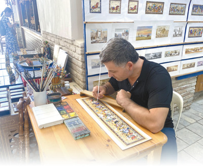 一名畫(huà)師在布哈拉一處集市內(nèi)創(chuàng)作有關(guān)古絲綢之路的畫(huà)作。