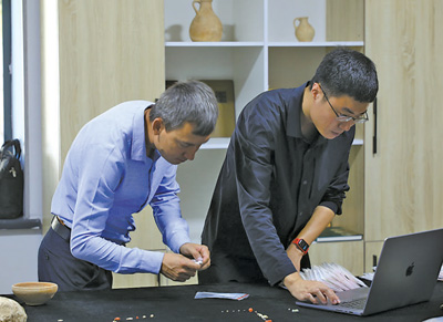 撒馬爾罕考古研究所教授阿爾齊耶夫·科米利翁(左)和中國(guó)同事一起整理歸檔出土文物。