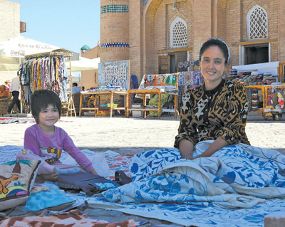 希瓦古城廣場(chǎng)上的手工藝人扎米拉(右)和孩子。