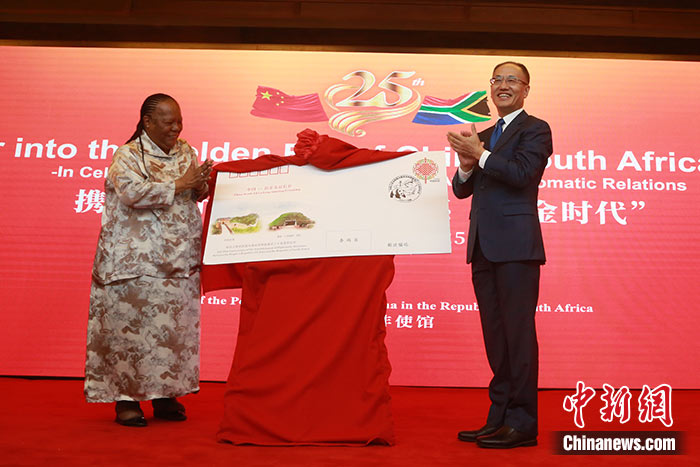 當(dāng)?shù)貢r(shí)間12月12日,中國(guó)駐南非大使館隆重舉行慶祝中國(guó)和南非建交25周年招待會(huì)。圖為中國(guó)駐南非大使陳曉東同南非外長(zhǎng)潘多爾為中南建交25周年紀(jì)念封揭幕。 中新社記者 王曦 攝