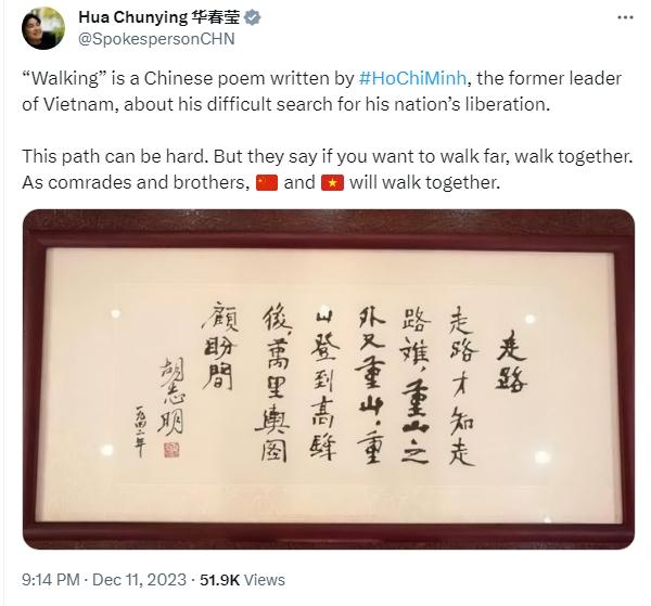 華春瑩寫道,“《走路》是越南老一輩領(lǐng)導(dǎo)人胡志明所寫的一首漢語(yǔ)詩(shī),講述了他爭(zhēng)取國(guó)家解放的艱難歷程。這條路可能很艱難。但人們說(shuō),如果想走得遠(yuǎn),就要一起走。作為同志和兄弟,中國(guó)和越南將一路同行。”