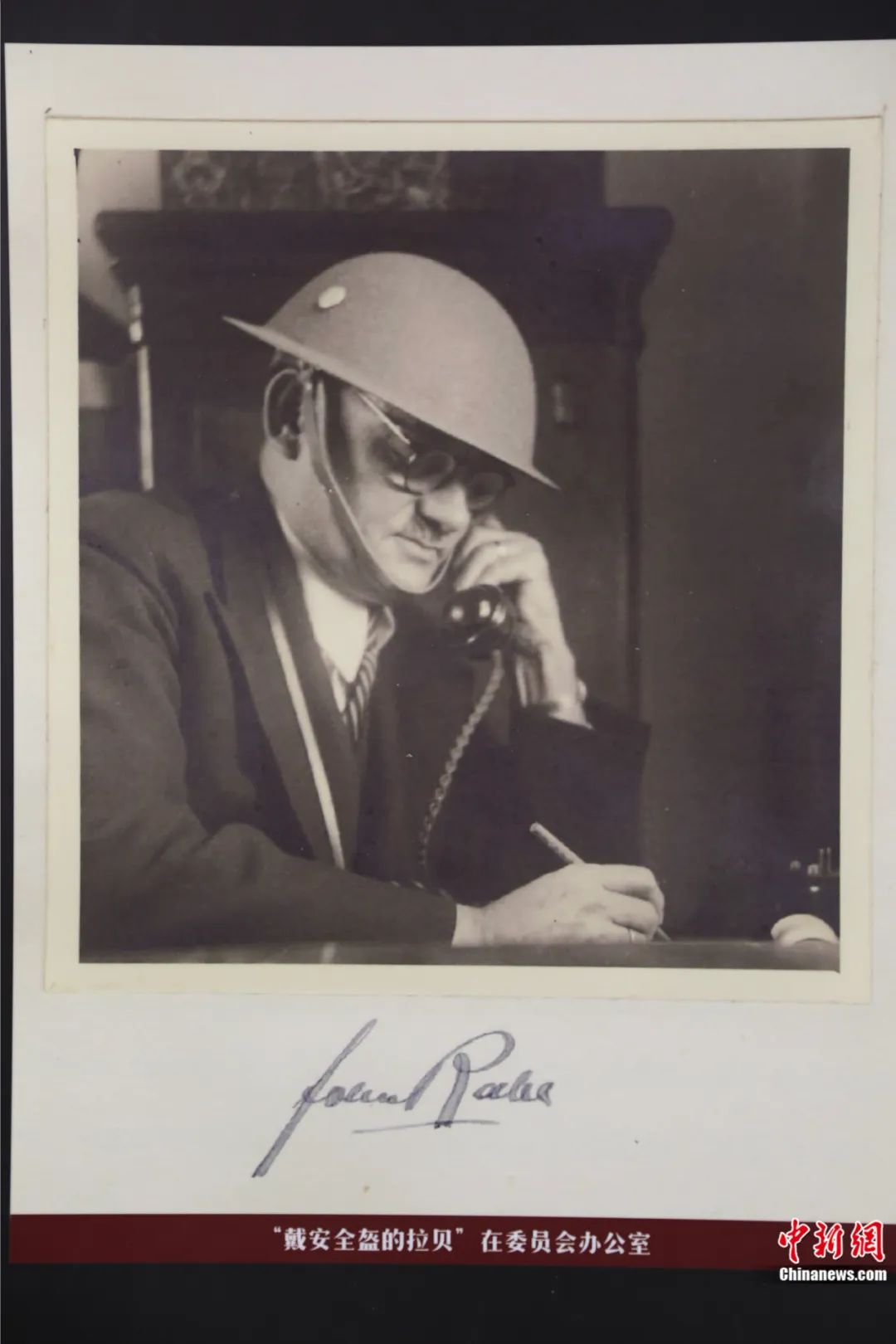 約翰·拉貝北京交流中心展覽上,約翰·拉貝在南京安全委員會(huì)辦公的資料圖。袁理 攝