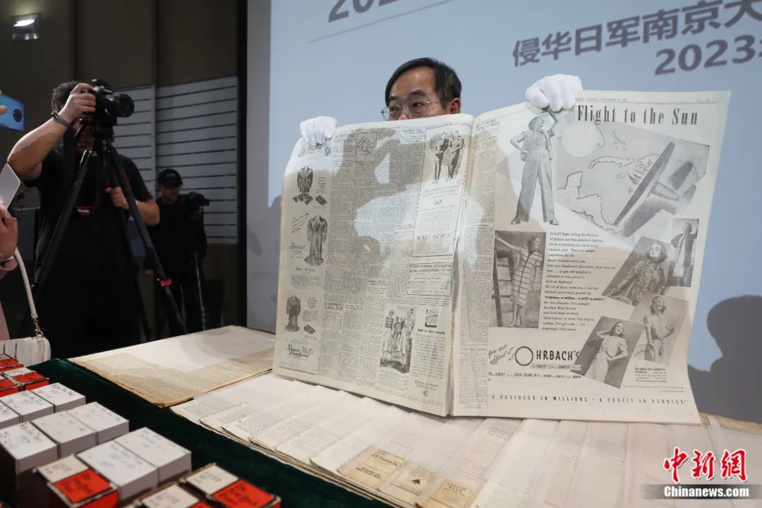 2023年12月8日,侵華日軍南京大屠殺遇難同胞紀(jì)念館舉行2023年新征文物史料新聞發(fā)布會(huì)。美籍華人魯照寧向媒體展示1937年12月6日出版的紐約時(shí)報(bào),報(bào)紙對(duì)侵華日軍進(jìn)攻南京做了詳細(xì)報(bào)道。泱波 攝