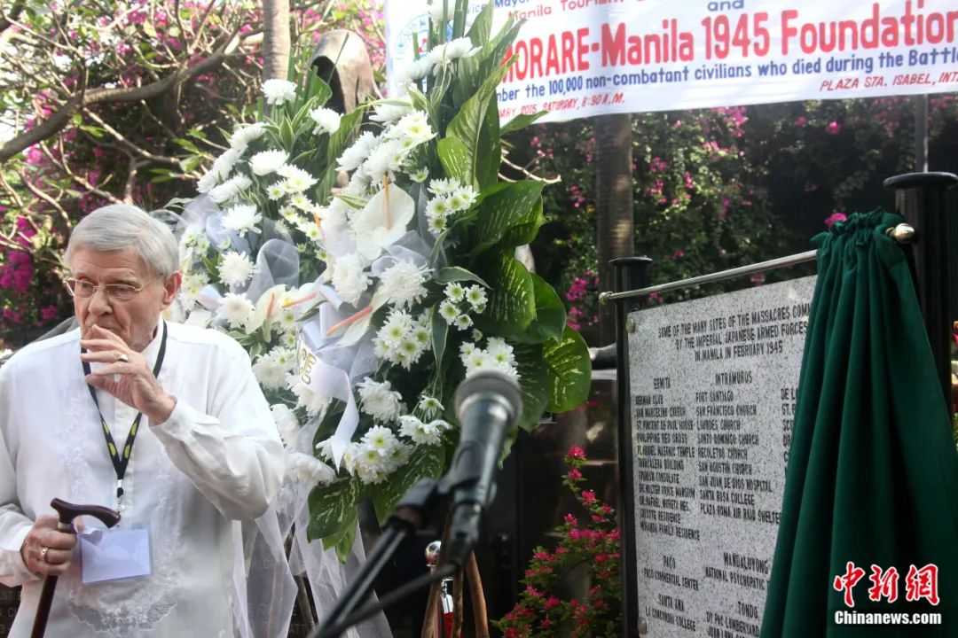 2015年2月14日,菲律賓“銘記馬尼拉1945基金會(huì)”在馬尼拉舉辦活動(dòng),紀(jì)念馬尼拉戰(zhàn)役70周年。圖為與會(huì)人士揭開記載日軍在馬尼拉多處實(shí)施大屠殺地點(diǎn)的牌匾。張明 攝