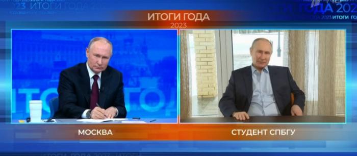 俄總統(tǒng)2023年年度記者會(huì)上,主持人播放了一段帶有普京影像和聲音的合成視頻,畫面左側(cè)為普京,右側(cè)為合成人像。圖片來源:俄羅斯第一頻道截圖