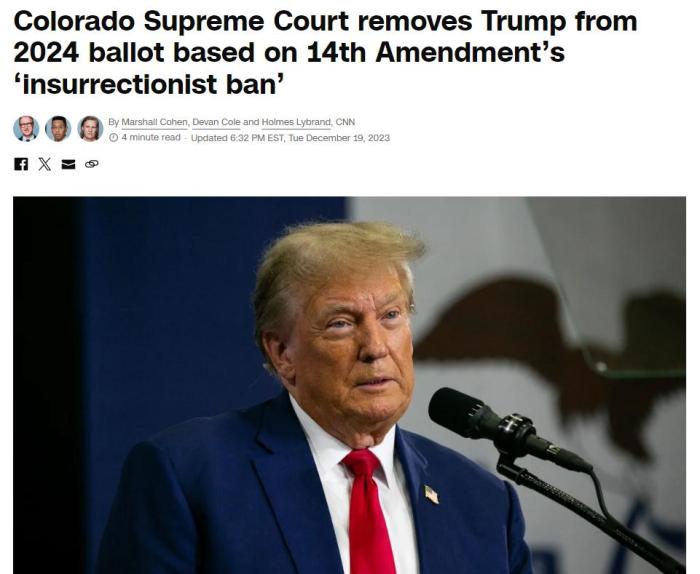 中新網(wǎng)12月20日電 綜合美媒報(bào)道,美國(guó)科羅拉多州最高法院當(dāng)?shù)貢r(shí)間19日裁定,根據(jù)美國(guó)憲法第14修正案,鑒于美國(guó)國(guó)會(huì)騷亂事件,將共和黨籍前總統(tǒng)特朗普從該州2024年總統(tǒng)初選的投票中除名,認(rèn)為他沒(méi)有資格競(jìng)選美國(guó)總統(tǒng)。