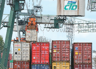 在德國多特蒙德港,機械設備在吊裝集裝箱。