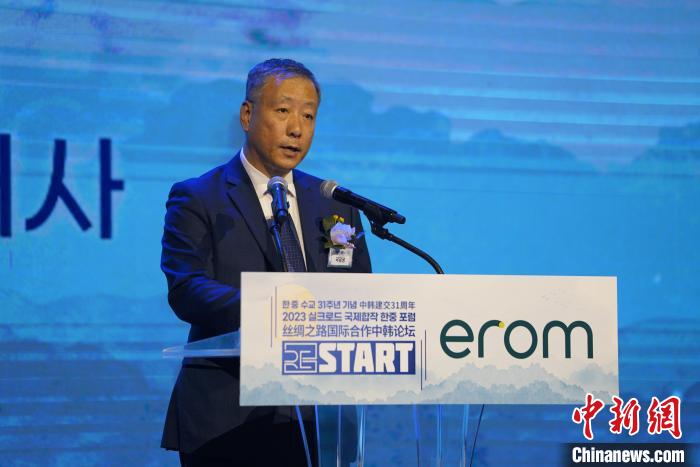 圖為韓中絲綢之路國(guó)際交流協(xié)會(huì)會(huì)長(zhǎng)李先虎致辭。中新社記者 劉旭 攝