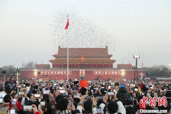 隨著國(guó)旗升至旗桿頂端,萬(wàn)羽和平鴿騰空而起,繞著天安門廣場(chǎng)盤旋。在《歌唱祖國(guó)》的旋律中,“新年快樂(lè)!”“我愛你,祖國(guó)!”……歡呼聲和掌聲此起彼伏。