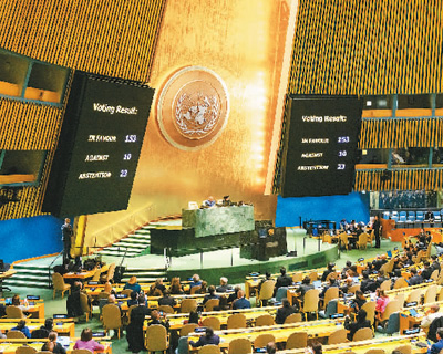 2023年12月12日,聯(lián)合國(guó)大會(huì)緊急特別會(huì)議投票通過(guò)決議,要求在加沙地帶立即實(shí)現(xiàn)人道主義?;?。圖為會(huì)議投票現(xiàn)場(chǎng)。