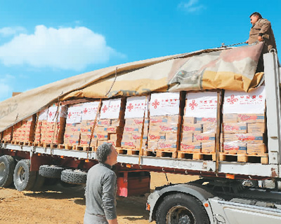 2023年11月27日,在埃及開(kāi)羅,中國(guó)向加沙地帶提供的人道主義物資裝車(chē)等待發(fā)運(yùn)。