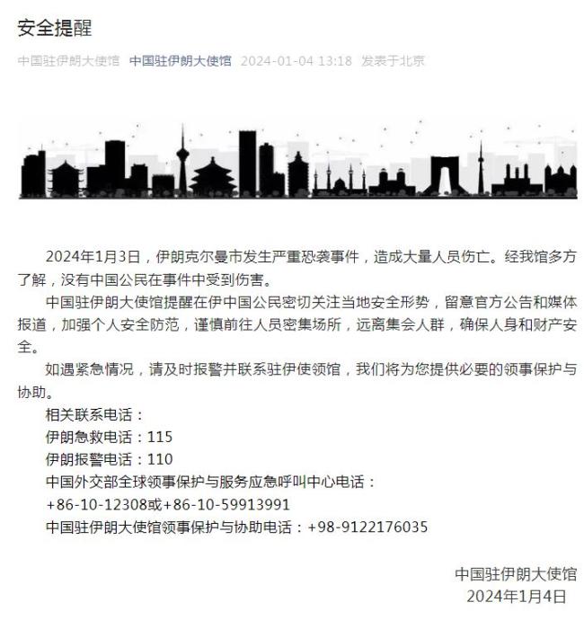 中國(guó)駐伊朗使館:沒(méi)有中國(guó)公民在克爾曼市恐襲事件中受到傷害