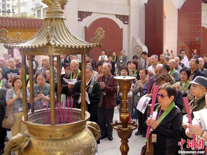 2004年,日本高野山真言宗佛教團(tuán)團(tuán)員在福州開(kāi)元寺空海塑像前焚香祭拜空海大師。陳國(guó)明 攝