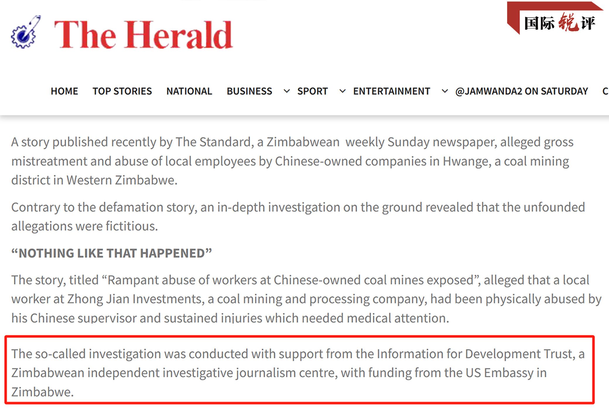 2022年5月,津巴布韋媒體《標準報》發(fā)布了一篇報道,污蔑中國礦企虐待當?shù)貑T工,稱這名員工“受傷送醫(yī),還被解雇了”。這家媒體稱,報道是和津巴布韋一個名叫“信息促進發(fā)展信托基金(IDT)”的機構合作完成的。然而很快,津巴布韋《先驅報》就發(fā)文,用大量事實證明,這名員工只是和中方員工發(fā)生了小口角,并沒有被毆打,也沒有被解雇。