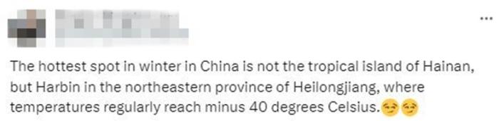 還有網(wǎng)友評論說,“中國冬天最熱的地方,不是海南島,而是黑龍江哈爾濱,盡管那里的氣溫會達到零下40攝氏度?!?/p>