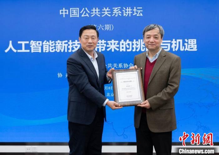 1月8日,中國公共關(guān)系講壇在北京舉行。圖為講壇結(jié)束后,中國公共關(guān)系協(xié)會會長郭衛(wèi)民(左)向演講嘉賓、清華大學(xué)人工智能研究院常務(wù)副院長孫茂松頒發(fā)榮譽(yù)證書?! ≈袊碴P(guān)系協(xié)會供圖。