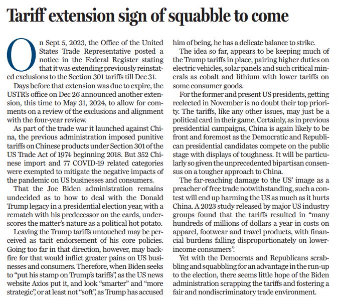美國(guó)貿(mào)易代表辦公室近期宣布,進(jìn)一步延長(zhǎng)對(duì)352項(xiàng)已恢復(fù)豁免的中國(guó)進(jìn)口商品和77種與新冠防疫相關(guān)的中國(guó)商品的301條款關(guān)稅豁免期,期限由2023年12月31日延至2024年5月31日。