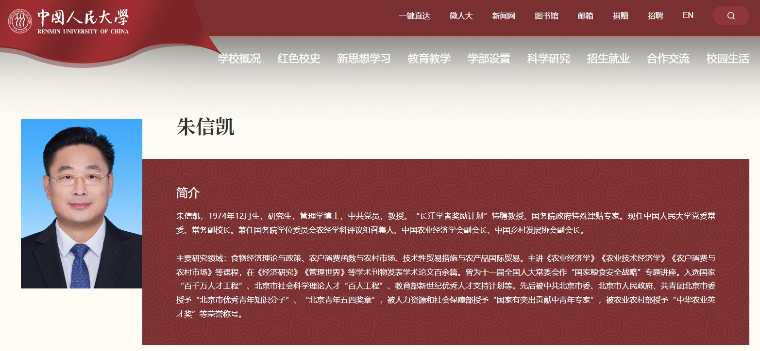 中新網(wǎng)1月11日電 中國人民大學官網(wǎng)“現(xiàn)任領導”欄目更新顯示,朱信凱(1974年12月生,江蘇沛縣人),已任中國人民大學黨委常委、常務副校長。