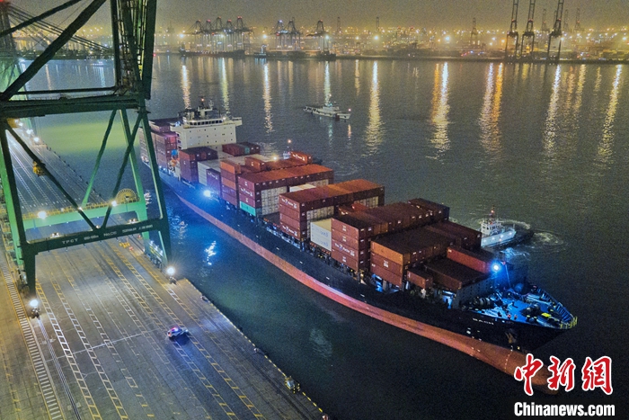 1月16日晚,裝載著2500余噸智利車?yán)遄拥拇笮图b箱班輪“巴赫”號,順利抵達(dá)天津港太平洋國際集裝箱碼頭,標(biāo)志著天津港與南美洲直航的首條“車?yán)遄涌炀€”正式開通?!败?yán)遄涌炀€”始發(fā)于智利圣安東尼奧港,直抵天津港。未來一周,還將有2艘次智利車?yán)遄迂洿诌_(dá)天津港,累計(jì)8300噸車?yán)遄蛹捌渌厦乐蕻a(chǎn)品從天津港上岸。(無人機(jī)照片) 中新社記者 佟郁 攝
